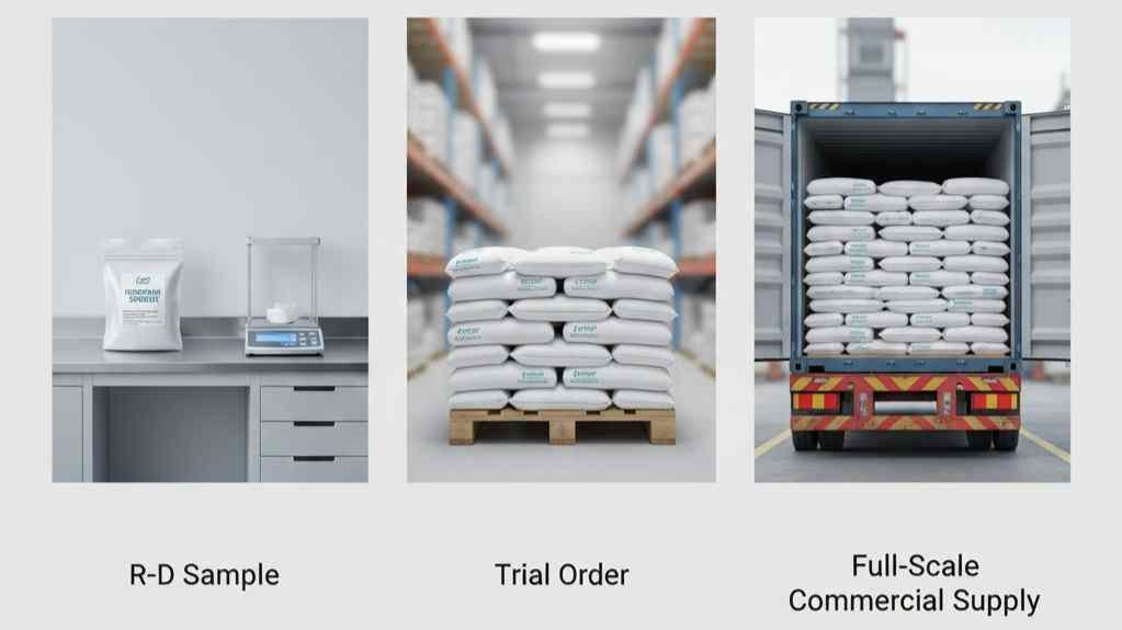 A professional supplier must support the entire development process. The R&D phase4 starts with small samples (100g - 1kg) shipped fast with a full COA. The pilot phase requires a trial order of 250kg to 1,000kg for factory-scale testing. Finally, we scale up to full production5 volumes. The key is to ensure the quality is identical at every stage, from the first gram to the last ton.