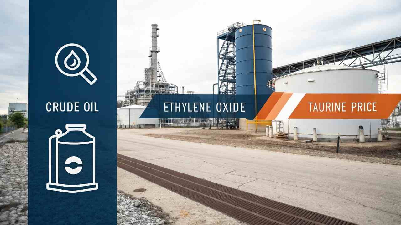 The production story for Taurine starts at an oil refinery. Its key raw materials are derived from petrochemicals, creating a direct cost chain: Crude Oil → Ethylene → Ethylene Oxide → Taurine. A sustained price increase at the start of this chain will inevitably ripple through to the final product. A factory's largest costs are energy and raw materials3; when these inputs become more expensive, the factory must pass that cost on to buyers.