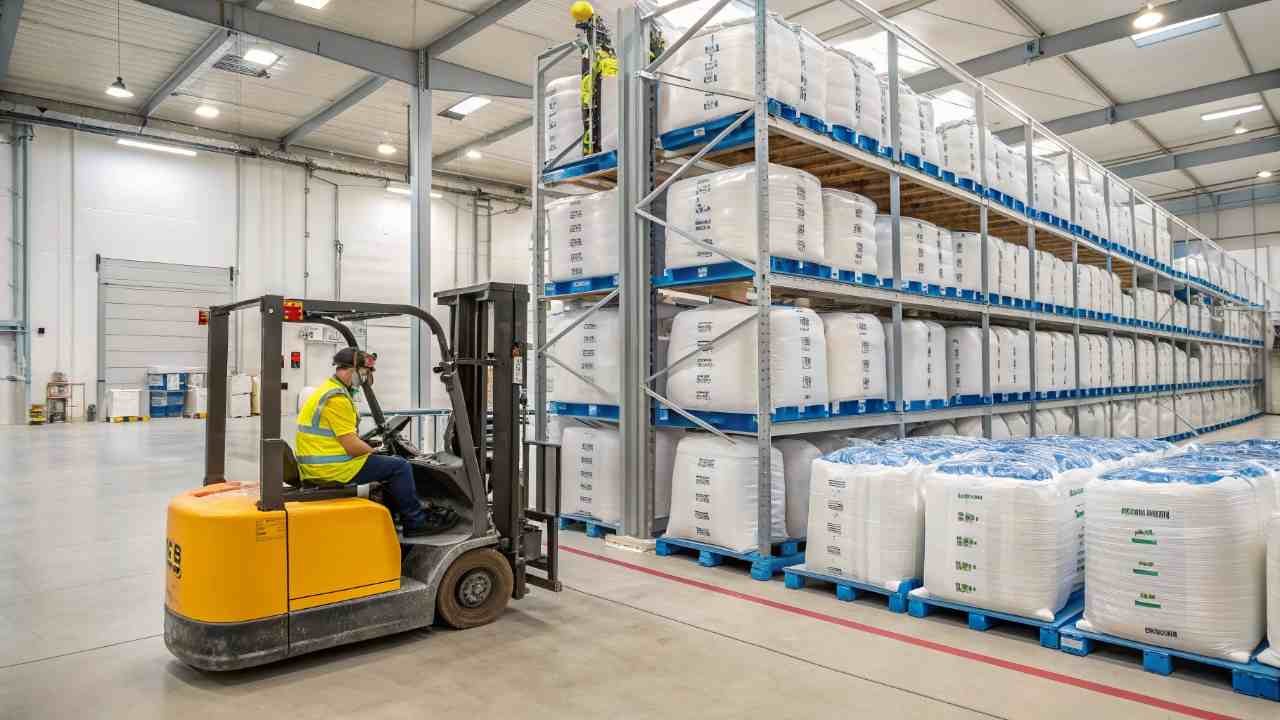 The most critical warehouse practice is a strict First-In, First-Out (FIFO) system. Other key practices include keeping products on pallets, maintaining a clean environment, and ensuring that bags are only opened immediately before use to protect them from ambient humidity.
