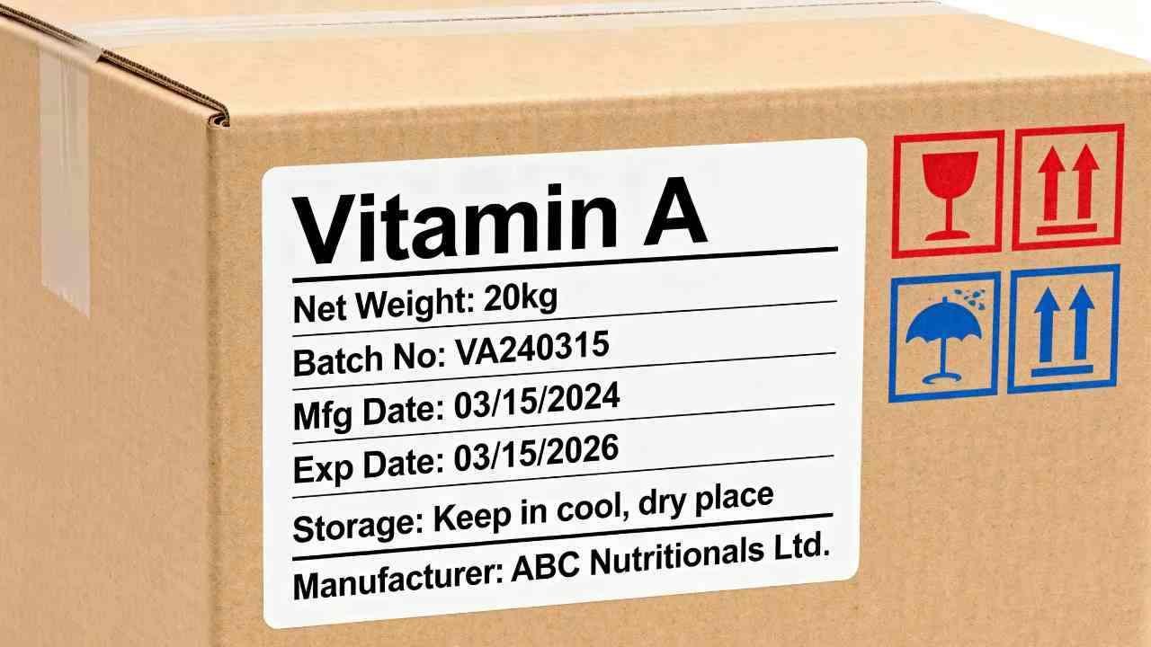 The standard export packaging for Vitamin A powder is a 20kg or 25kg multi-wall cardboard carton. Critically, inside the carton, the vitamin is contained within a heat-sealed, multi-layer aluminum foil bag that has been flushed with nitrogen.